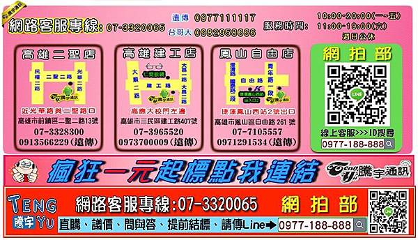 騰宇通訊TengYu 含淚拍賣庫存~網址裡面全部3c產品~通通一元起標~無低價~標多少賣多少~決不流標~按下圖可連到奇摩拍賣網址~可超商取貨付款加六十~全省可交易~續約或攜碼可退購機差價或換禮卷或通話費